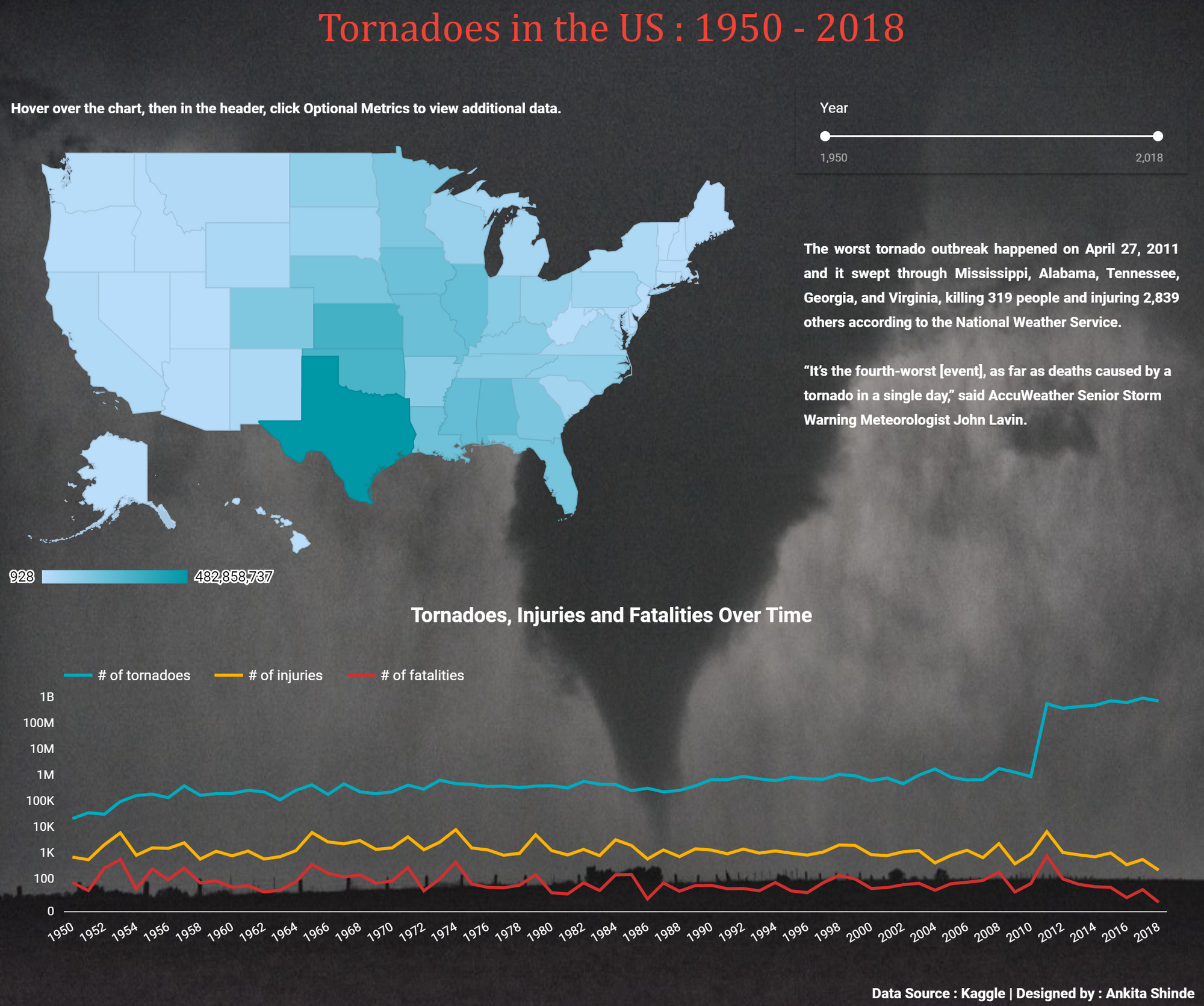 This visual looks into the number of tornadoes, injuries, and fatalities by state and over time from 1950 to 2018.